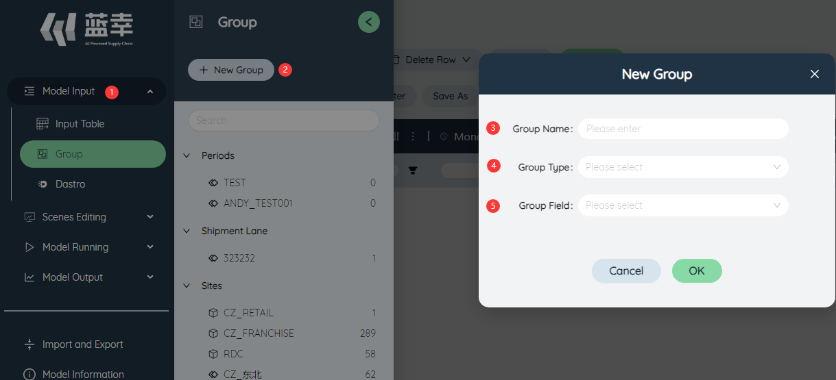 Clicking most of the sub-function module buttons on the left will pop up a sidebar to display a list of newly created items in the current model, such as input table, output table, group, scenario, etc. The items are sorted alphabetically by default.