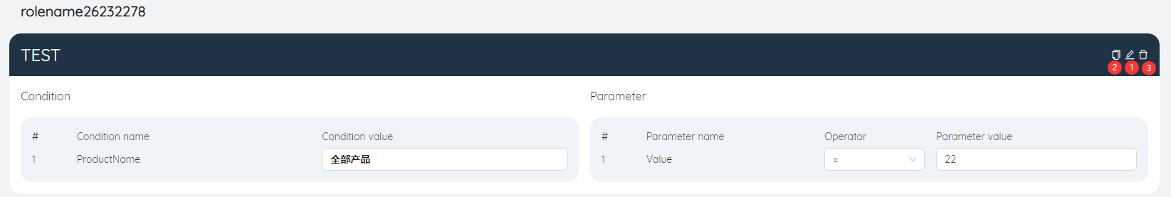 In the sidebar of some functions (such as group, scenario, scenario item, scenario editor, map), clicking an item will display the buttons for renaming, copying, and deleting the item, which are located on the right side of the item, at the mark ①