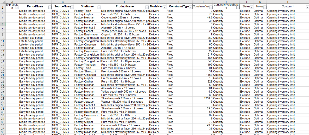 The route that ships all Products from the fake factory MFG_DUMMY to the factory's individualGroups MFG is for the model to calculate the InitialInventory Quantity by itself, without affecting the analysis of the model results. The transportation ModeName is filled in at will, and the transmission is filled in the picture. VariableTransportationCost needs to be set much larger than other normal lines, so that the model chooses the Dummy fake factory when any other lines can't meet the needs. The model will automatically calculate the volume of goods sent by the fake factory to each factory, that is, InitialInventory. The following field filling instructions do not contain this special data.