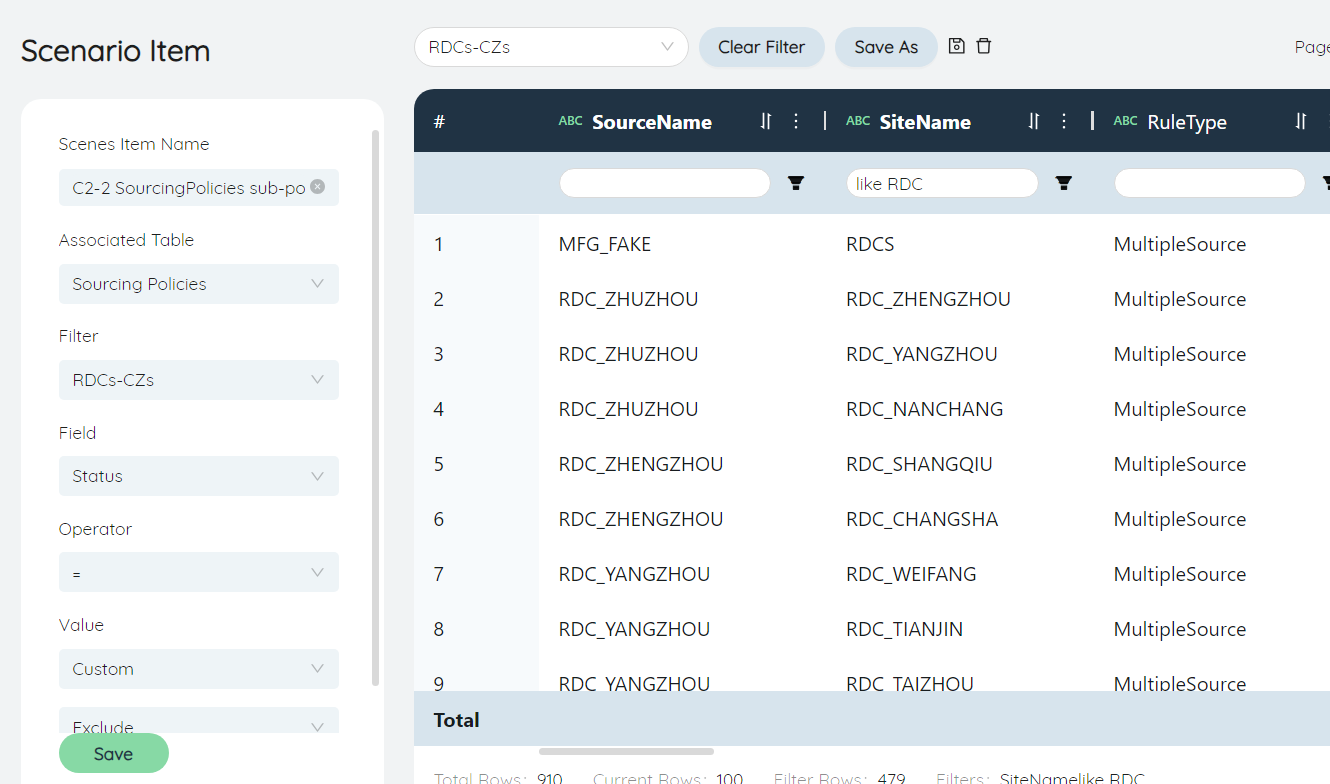 SourcingPolicies record the flow of Products in the supply chain network. Including the purchase of down jackets from the sub-warehouses from the main warehouse, and the purchase of down jackets from the stores from the sub-warehouses. You need to fill in the starting point Name, Sites Name, Products Name. Fill in according to the original data-shipping record (total warehouse-sub-warehouse), original data-shipping record (sub-warehouse-store), one line corresponds to a starting point, a combination of Sites, and Groups of Products, which cannot be repeated.